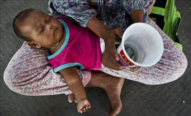 The reality of a tired baby on the lap of a beggar is harsh and depressing. (AP)