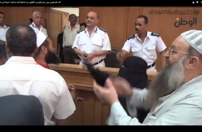 A fully covered woman pounds the desk of the police while leading a chant in Egypt. (screen grab from YouTube)