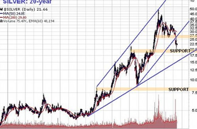 Why is he so confident? Well for Mr. Maund it is all in the charts. Recent price action shows strong support for the silver price close to present levels. The 20-year chart still shows the uptrend intact.