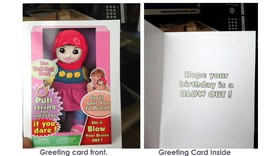 The card shows a female doll dressed in a pink hijab, saying things like ‘Pull string for message IF YOU DARE!’ and ‘She’ll love you to death!', insinuating that the innocent-looking child is in fact a suicide bomber.