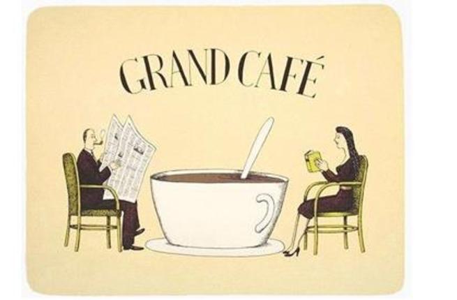One lithograph piece depicts a burger bun with a stack of papers in the middle instead of meat, as text reads "McKafka." Another cartoon shows a man and woman seated opposite each other, each immersed in reading, with a comically large cup of coffee between them as two words hang above their heads – "Grand Cafe."
