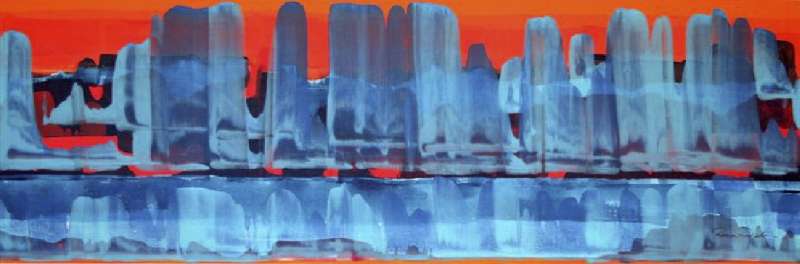 The artist’s technique is also intriguing. In depicting the desert stratigraphy, her colors appear to skate across the canvas, giving it an ironically watery aspect. The blue line near the bottom of the canvas – which separates the red bits into two parts – adds an impression of reflection, as though the red mount were reflected in a body of water.