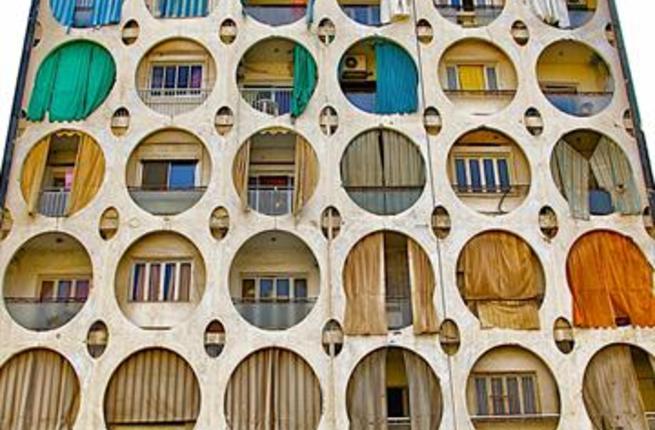 Though the building itself is symmetrical in design, the photograph lacks the geometric simplicity of its German counterpart, due to the colorful striped tarpaulins hung by residents. These tattered, mismatched swathes of cloth render the shot messier, but ultimately more charming.