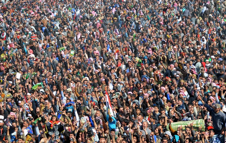 Meanwhile, thousands of Sunni Muslims took to the streets of Ramadi, Mosul and Baghdad to protest against anti-terrorism laws that they say target them as a minority.