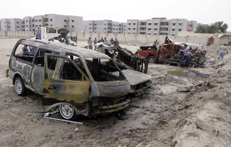 Iraqi emergency personnel and civilians gather around the site of a car bomb explosion near the outskirts of the south Iraq city of Basra, on March 17, 2013, killing 10 people and wounding 16, the head of the Basra provincial council security committee said. (AFP PHOTO/STR)