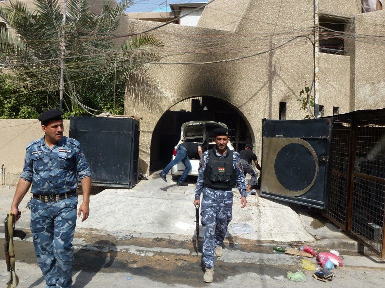 Iraqi policemen inspect the premisses of the al-Mustaqbal (The Future) newspaper in the Karrada district of Baghdad on April 2, 2013, following an attack. (AFP PHOTO/SABAH ARAR)