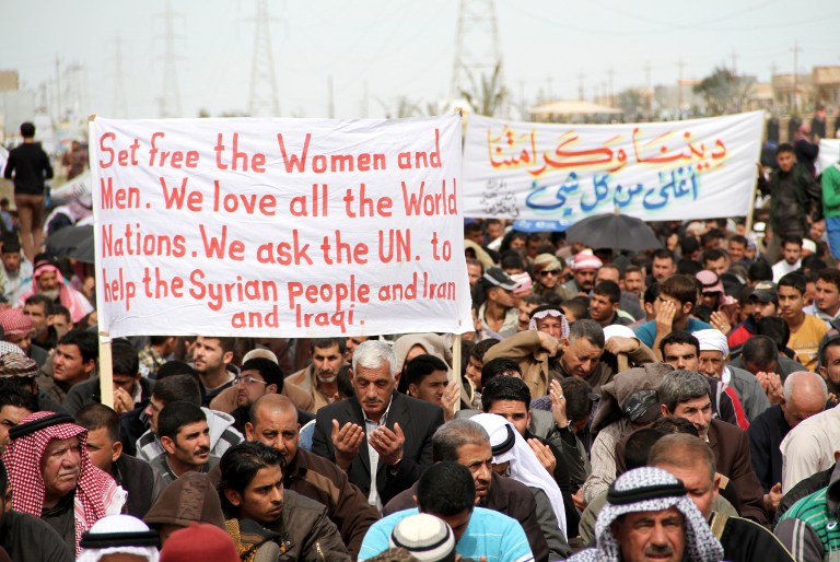 Iraqi protestors gather during a demonstration in the city of Samarra on March 8, 2013. Protestors have taken to the streets in Sunni-majority areas for more than two months, calling for the resignation of Prime Minister Nouri al-Maliki. (AFP PHOTO / MAHMOUD AL-SAMARRAI)
