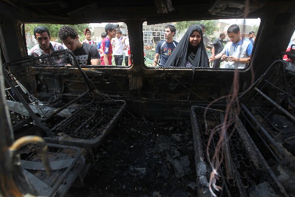 By-standers look at the wreck of a bomb used in a sectarian suicide attack in Baghdad. AFP Photo