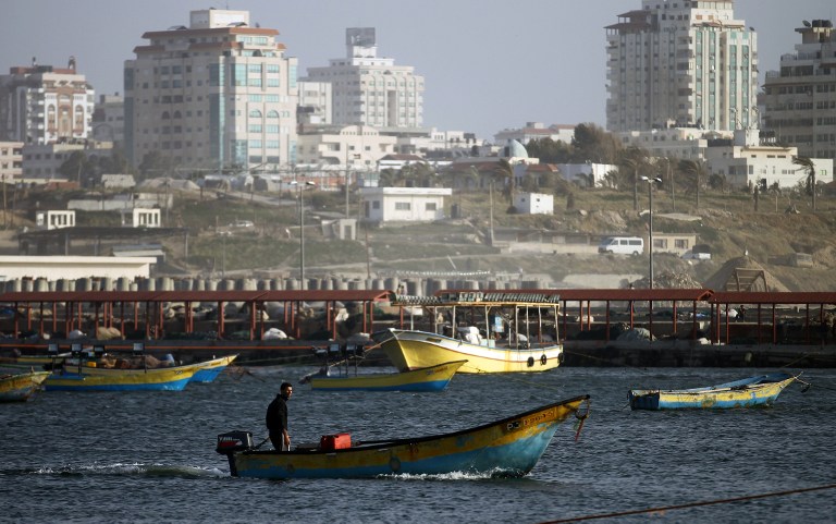 A Palestinian fisherman rides a boat near the port of Gaza City on March 22, 2013. Israel cut the distance from the shore that Gaza fishermen are allowed to sail from six to three miles and shut the Kerem Shalom goods crossing from Israel into the Gaza Strip in response to a rocket attack against southern Israel. (AFP PHOTO/MOHAMMED ABED)