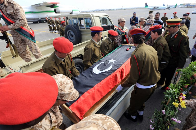 Libyan army soldiers carry the coffin of one of two soldiers killed in action in the oasis town of Bani Walid during a memorial service at Mitiga Airport, in Tripoli, on Sunday. (AFP PHOTO/MAHMUD TURKIA)