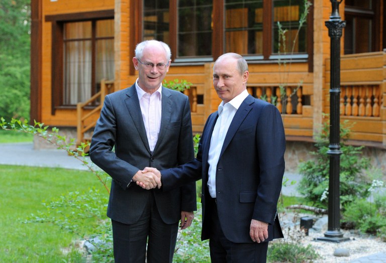 Russia's President Vladimir Putin shakes hands with EU President Herman Van Rompuy (Mikhail Klimentyev/ AFP)