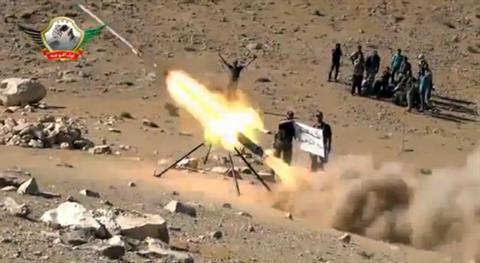An image grab taken from a video uploaded on YouTube on May 29, 2013 allegedly shows members of the Al-Tawhid brigade firing missiles from Syria towards the Lebanese town of Hermel, a few kilometres from Baalbek in the Bekaa valley. AFP photo/YouTube