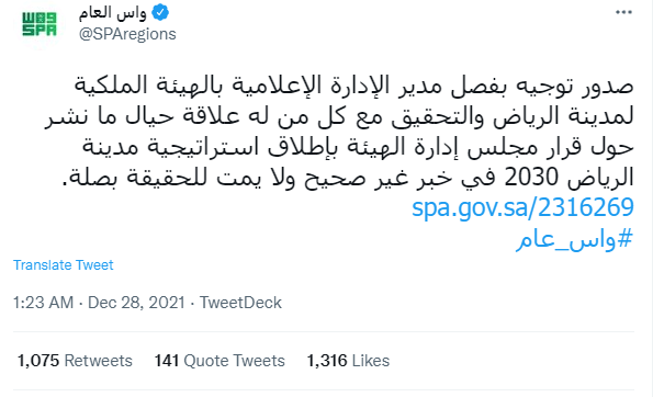 أصدر مجلس الوزراء السعودي قرارًا بإعفاء مدير الإدارة الإعلامية في الهيئة الملكية لمدينة الرياض من منصبه بعد نشره خبرًا غير صحيح ولا يمت للحقيقة بصلة يتعلق بولي العهد الأمير محمد بن سلمان.