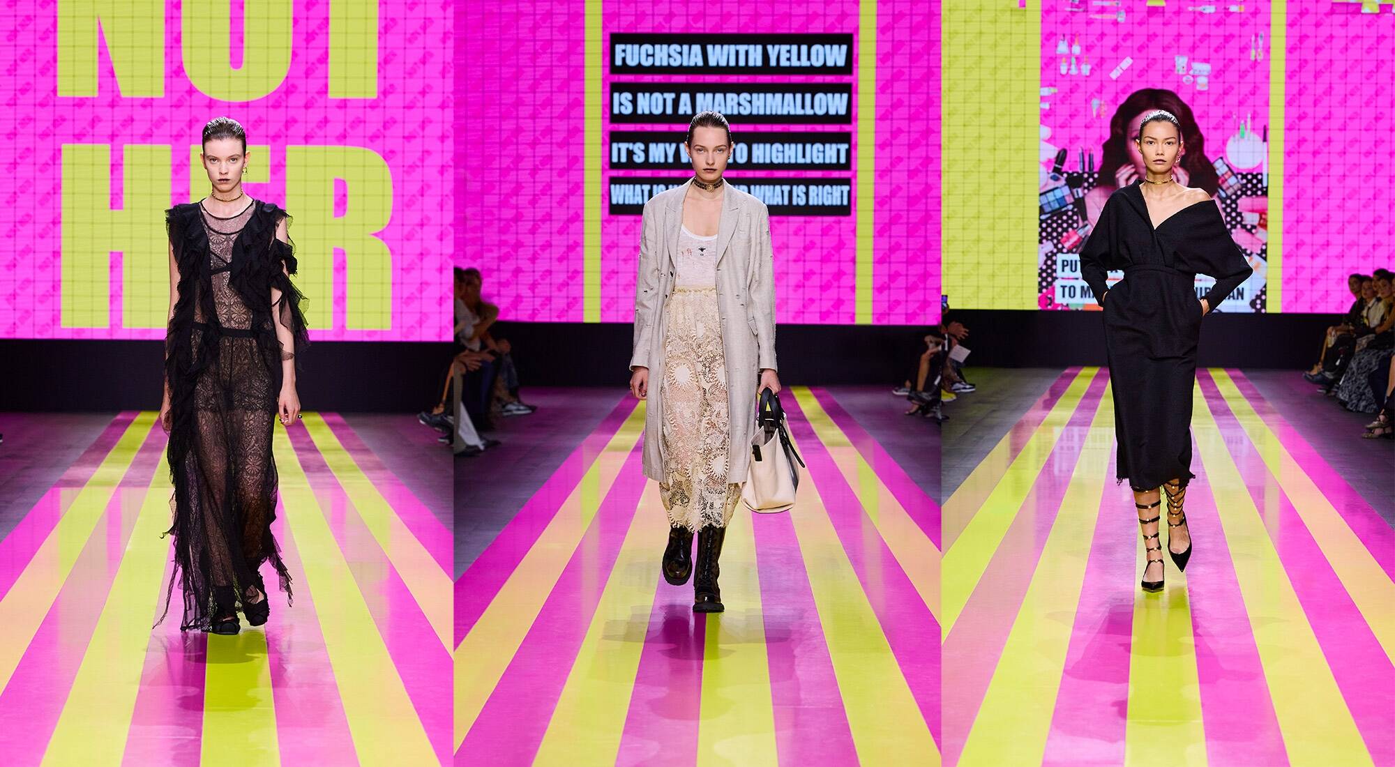 سارت العارضات على مدرج العرض بإطلالاتهن القوية والمعبرة وخلفهن الديكور الساحر والقوي الخاص بالعرض، حيث أخذ ممشى العرض من اللونين الأصفر والفوشيا سمة خاصة له.