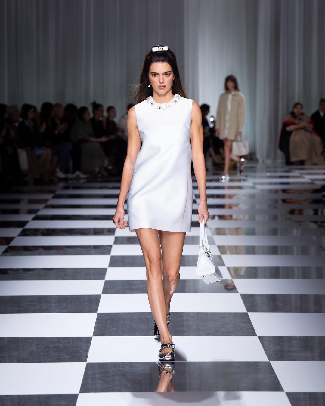 وتألقت كيندال بخطوات ثابتة على منصة العرض بفستان قصير باللون الأبيض، تميز بتصميم بسيط الذي طغى على التشكيلة بقصة الحرف (A) المستوحى من فترة الستينيات.