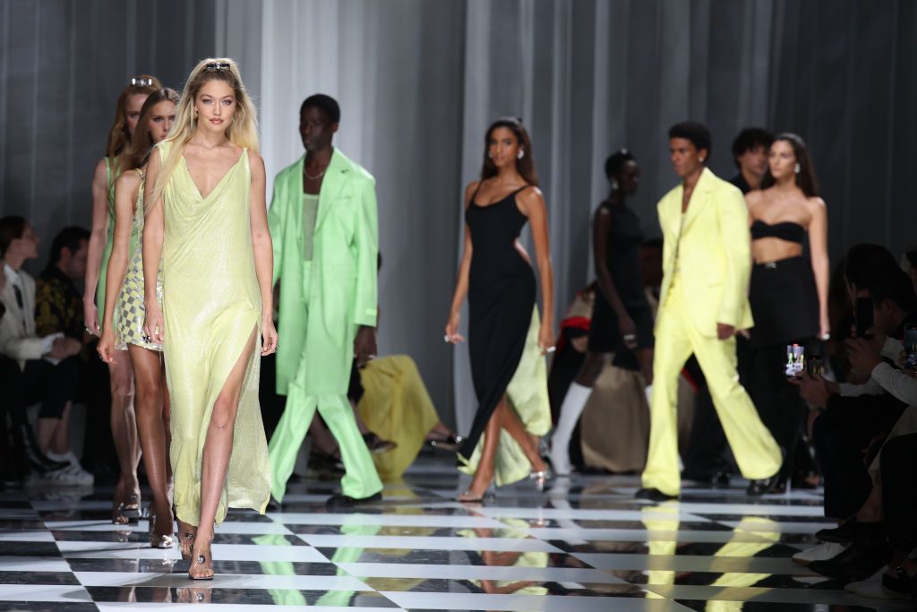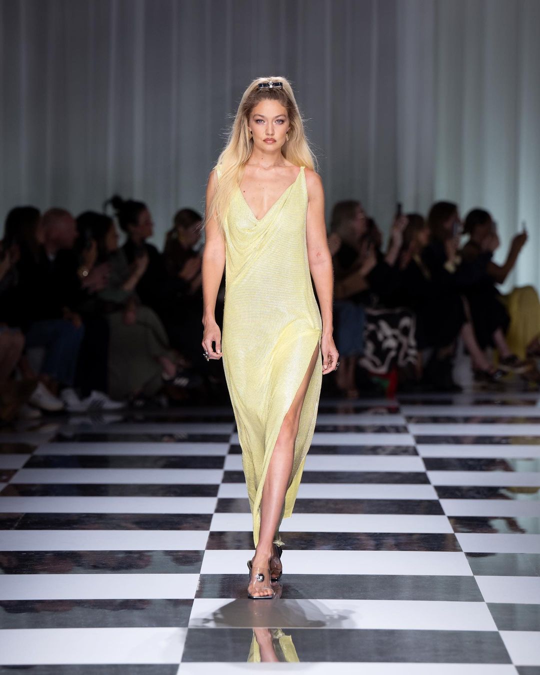 مشت عارضة الأزياء الأميريكية ذات الأصول العربية جيجي حديد على منصة عرض فيرساتشي لمجموعة ربيع صيف 2024، حيث ارتدت فستانا إنسيابيا باللون الأصفر الباستيل، والذي انسدل بكل نعومة على قوامها الممشوق بتصميمه المستقيم، كما زين بحمالات رفيعة مع فتحة ياقة على شكل حرف الـ(V)، تتدلى أطرافها بشكل مائل بأسلوب "درابد" على منطقة الصدر، كما زين فستانها بشق جانبي عالي، ونسق معه صندل مفتوح بشريط أمامي شفاف.