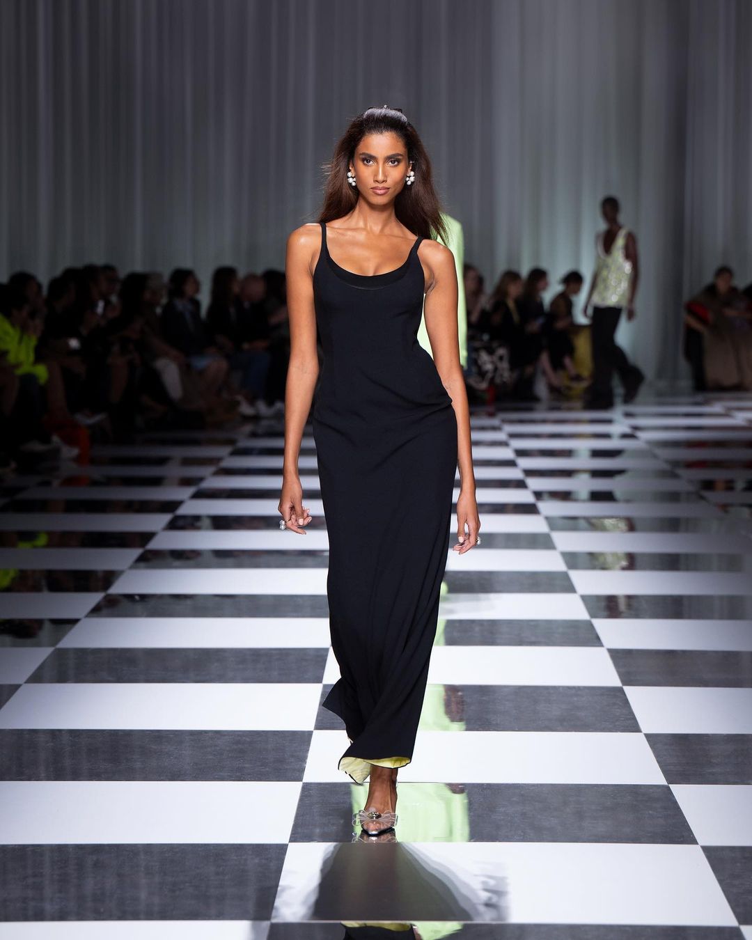 سجل عرض أزياء فيرساتشي لربيع وصيف 2024 عودة الـ"سوبر مودل" الأيقونية كلوديا شيفر وصديقة المصممة دوناتيلا فيرساتشي التي سارت على منصة العرض بفستان طويل باللون الأخضر الفاتح، تميز بقصة مجسمة عانق منحنيات قوامها الممشوق بقماش لامع مطبوع بنقشة المربعات الفضية والخضراء، كما تميز بحمالات رفيعة ممتدة على الظهر المكشوف، وزينت فتحة الياقة بتطريزات الورود المفرغة، وأكملت العارضة الشقراء تلك الإطلالة بحذاء مدبب "ميتاليك" باللون الفضي وبكعب عالي، لتعيد أمجاد أساطير ممشى العرض من الثمانينيات إلى يومنا هذا.