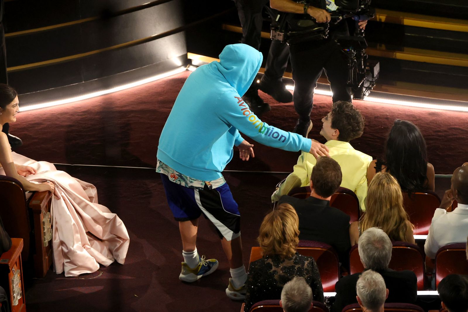 Sandler had one last surprise planned as he was making his dramatic exit, racing down the aisle until he came up to Timothée Chalamet, the Best Actor candidate. "Chalamet!" he said, embracing the actor from A Complete Unknown and kissing the side of his head before he ran out of the theater to thunderous cheers.