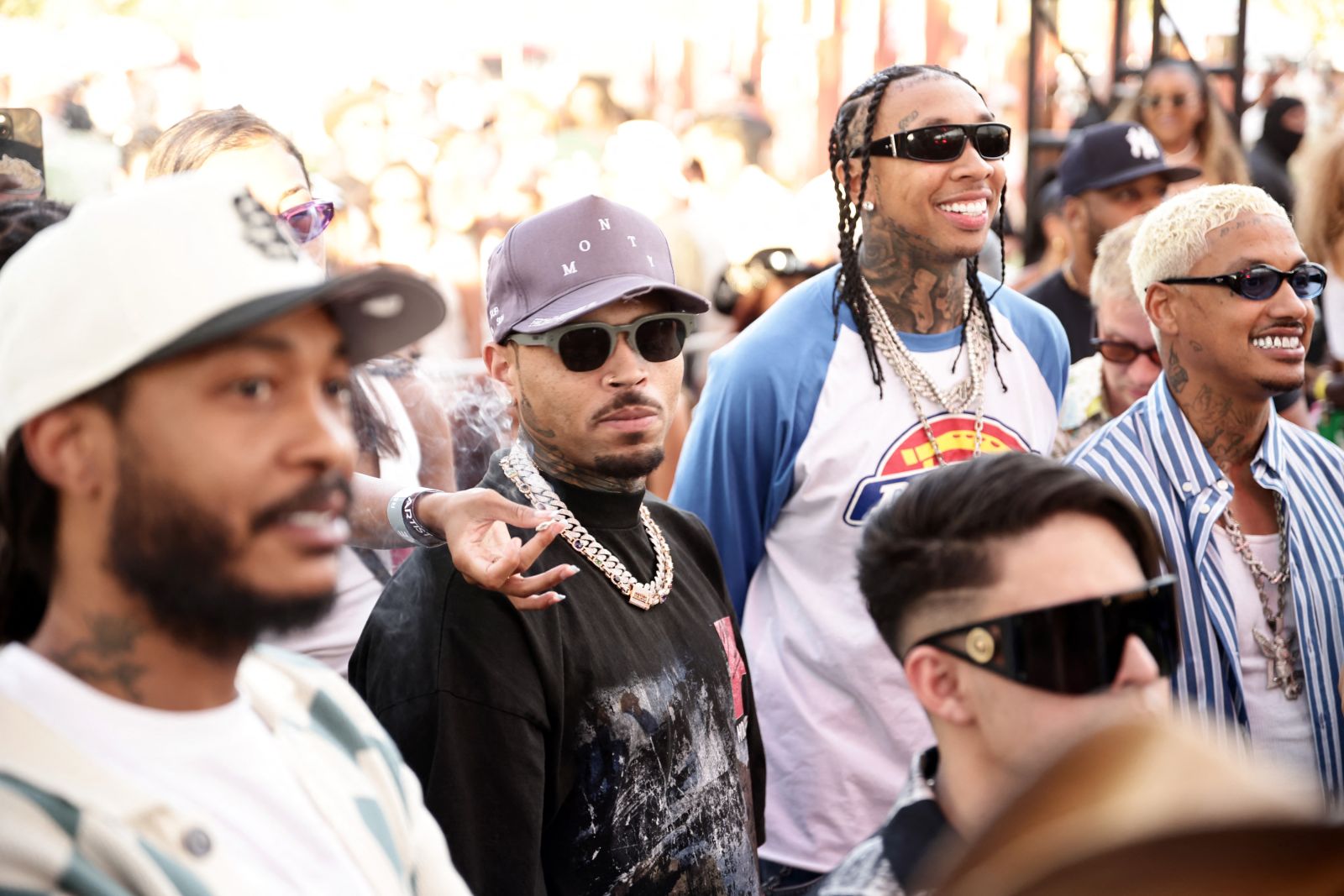 THERMAL, CALIFORNIA - APRIL 12: (L-R) Chris Brown, Tyga, and Alexander Edwards (Greg Doherty / via AFP)