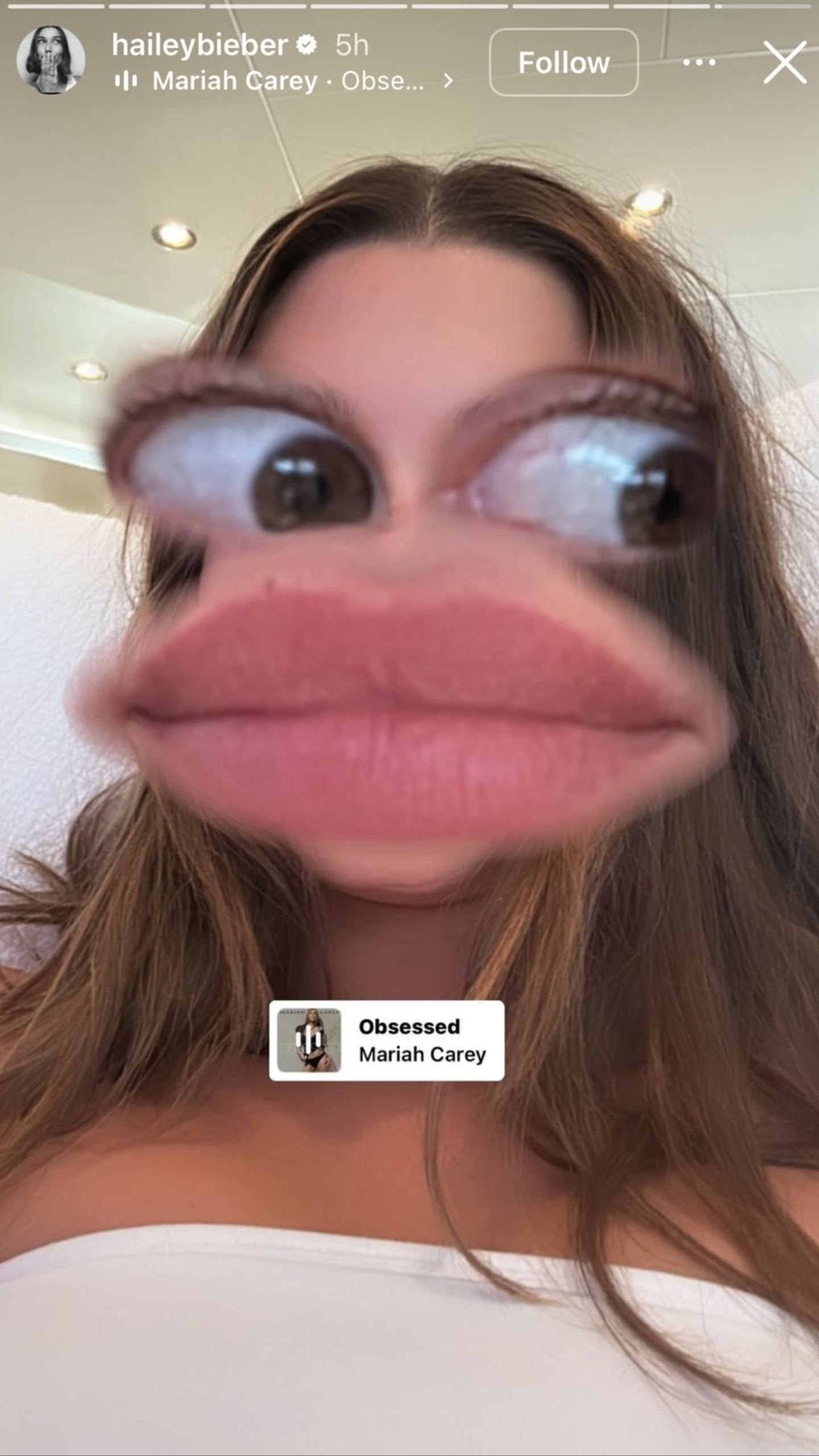 According to the review of her narrative, Hailey appeared to respond to it. The fashion model uploaded a picture of herself that had been altered using a filter that made her eyes and mouth appear larger. She accompanied the picture with the song "Obsessed" by Mariah Carey.