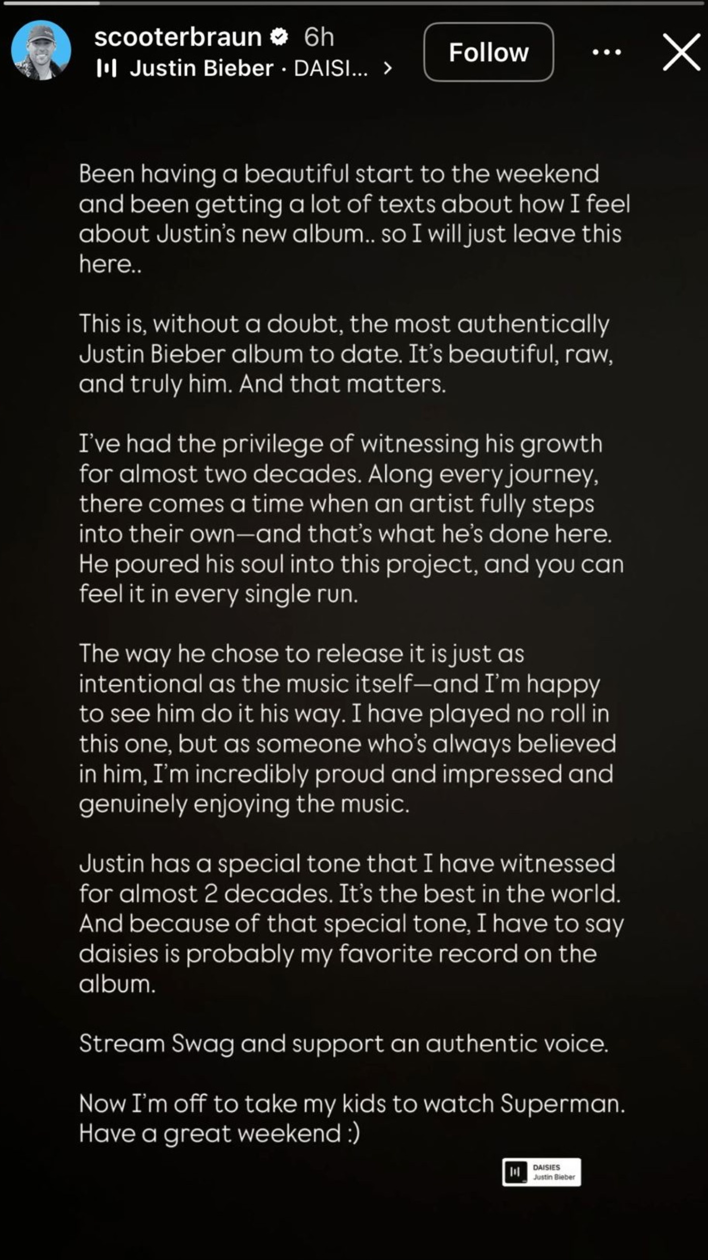 Over on his own Instagram account, Scooter posted a tale in which he discussed his feelings regarding Justin's most recent album.