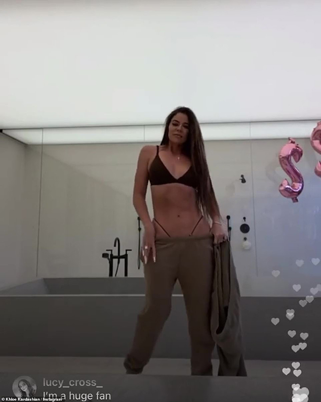A second video showed Khloe going on Instagram Live, where she removed her sweatshirt and rolled down her trousers to show off her toned frame.