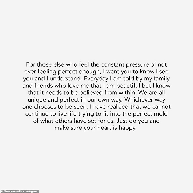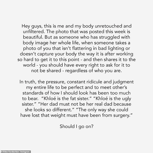 'In truth, the pressure, constant ridicule and judgment my entire life to be perfect and to meet other's standards of how I should look has been too much to bear. "Khloe is the fat sister." "Khloe is the ugly sister." "Her dad must not be her real dad because she looks so different." "The only way she could have lost that weight must have been from surgery." Should I go on?