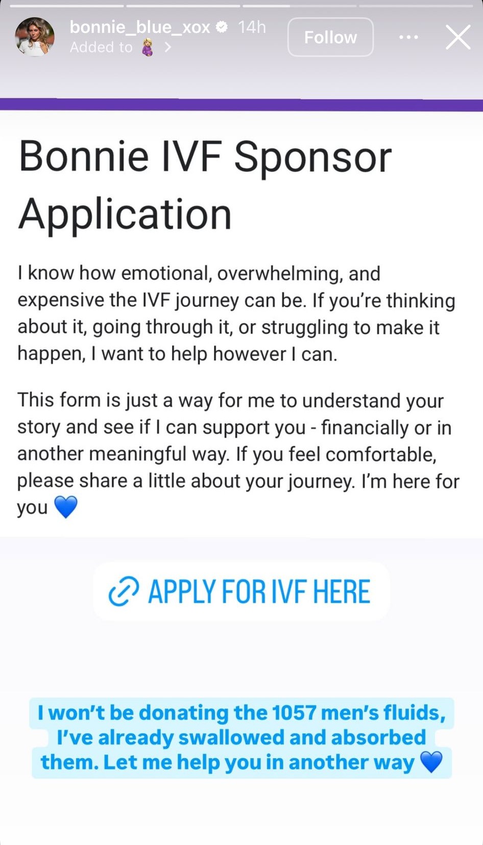 She added that getting pregnant was extremely "expensive" and that she intended to "pay for somebody's IVF journey" with the money she made from her sexual content.