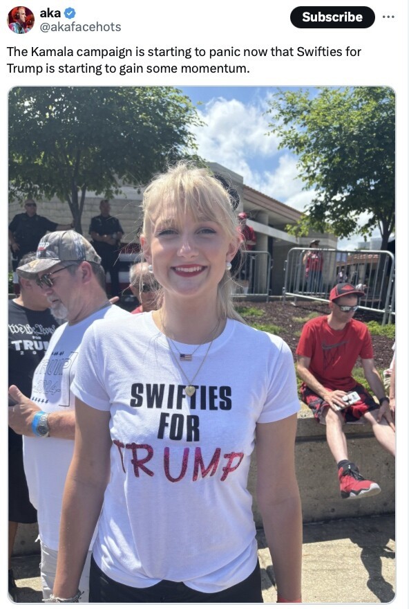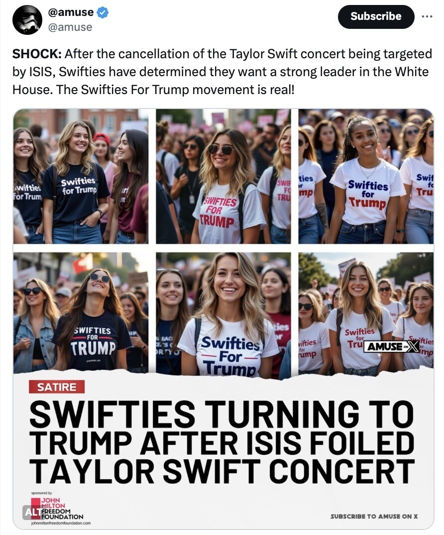 Another image, titled "satire," shows ladies wearing "Swifties for Trump" shirts and seems to have been initially posted on the social media site X. "Swifties turn to Trump after ISIS thwarts Taylor Swift's concert," it reads.