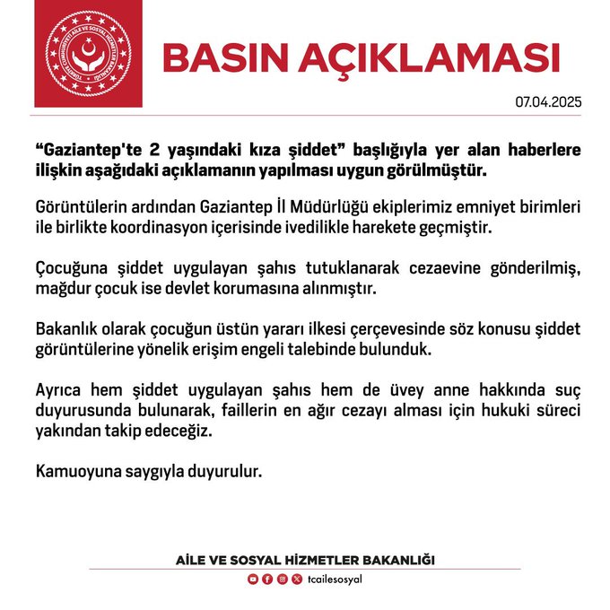 A statement was released by the Gaziantep Governorate regarding the incident: "Upon the sharing of images of violence against a child in our city on some social media channels on April 4, 2025, as a result of the investigation conducted by teams affiliated with our Provincial Gendarmerie Command, the foreign national named YE, who was understood to be the father of the child who used violence against the child in the images, was detained and subsequently arrested. The victimized child has been taken under protection by our Provincial Directorate of Family Social Services. It is respectfully announced to the public."