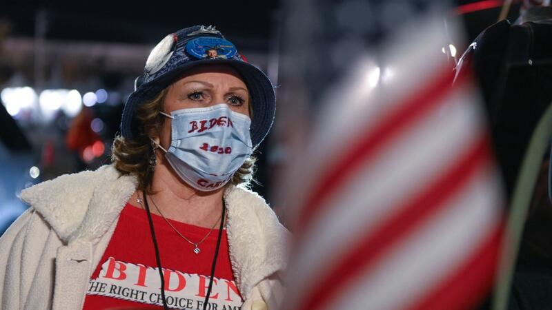 A supporter of Democratic presidential nominee and former Vice President Joe Biden looks at partial election results on a giant screen outside the Chase Center in Wilmington, Delaware on November 3, 2020. ROBERTO SCHMIDT / AFP