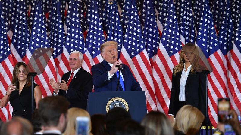 US President Donald Trump arrives to speak, flanked by Karen Pence, US Vice President Mike Pence and US First Lady Melania Trump. during election night in the East Room of the White House in Washington, DC, early on November 4, 2020. MANDEL NGAN / AFP