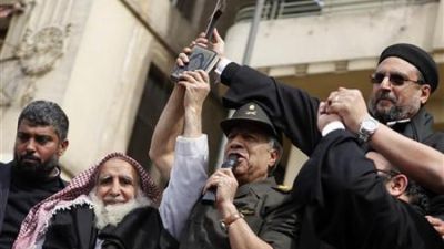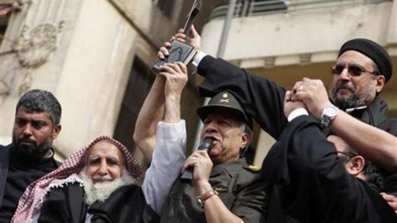 قبل أن يلقي قائد المنطقة المركزية العسكرية بالجيش المصري كلمته الى المتظاهرين في ميدان التحرير يوم الجمعة طلب مصحفا وصليبا ثم رفعهما في الهواء وأعلن "انتصار الثورة" التي أطاحت بالرئيس السابق حسني مبارك يوم 11 فبراير شباط.