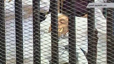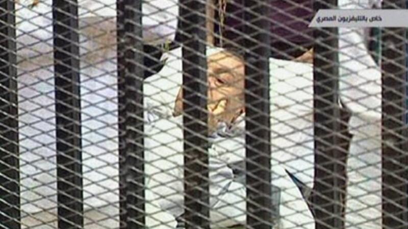 الرئيس المخلوع حسني مبارك في قاعة المحكمة.