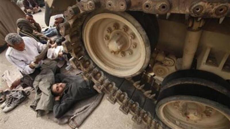 احد المعتصمين في ميدان التحرير يفترش الأرض إمام دبابات الجيش /ارشيف