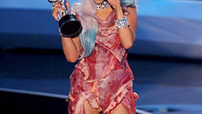 غاغا تسلمت كل تلك الجوائز وهي ترتدي قبعة و فستانا و حذاء صنعا من لحم العجل النيء !