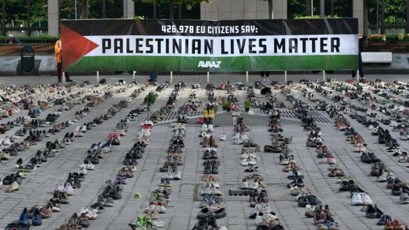 آلاف الأحذية أمام مقرّ الاتحاد الأوروبي ببروكسل تضامنا مع فلسطين