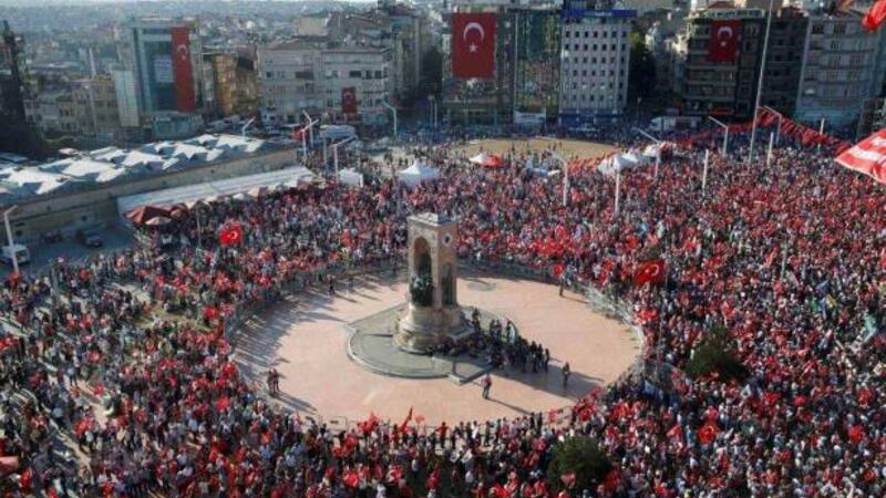 تجمع آلاف الاتراك في ساحة تقسيم وسط اسطنبول، تعبيرا عن تمسكهم بالديموقراطية، فضلا عن معارضتهم حال الطوارىء التي اعلنها الرئيس التركي رجب طيب اردوغان بعد محاولة الانقلاب.