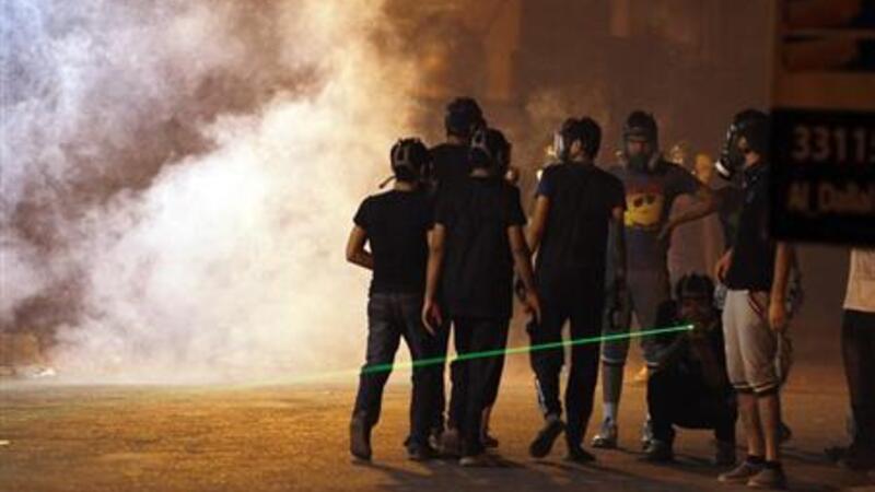 محتجون بحرينيون يضعون أقنعة واقية من الغاز أثناء اشتباكات مع الشرطة في قرية غربي المنامة