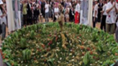 أضيفت بضع قطرات من زيت الزيتون في اللمسة الأخيرة على طبق سلطة "تبولة" صنعته مجموعة من الشركات الفلسطينية في محاولة لدخول موسوعة غينس للأرقام القياسية كأكبر طبق تبولة في العالم.