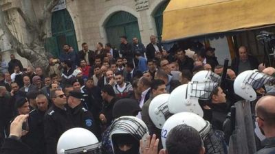 أصيب 11 فلسطينيا بينهم محمود الأعرج، والد الشهيد باسل الأعرج بجروح، اليوم الأحد، خلال فض أجهزة الأمن الفلسطينية بالقوة لوقفة احتجاجية أمام مجمع المحاكم في مدينة البيرة، رفضاً لمحاكمة الشهيد باسل وأربعة من رفاقه المعتقلين في سجون الاحتلال.