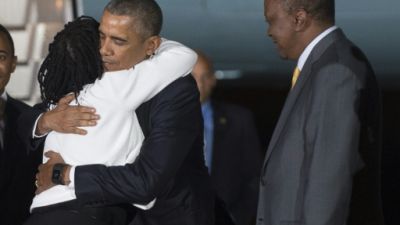 وافاد مراسلو فرانس برس ان الطائرة الرئاسية اير فورس وان حطت في مطار نيروبي الدولي حيث تسلم باقة من الورود عند نزوله من فتاة صغيرة قام بمصافحتها بعد ذلك، قبل ان يعانق نظيره الكيني اوهورو كينياتا الذي رحب به.