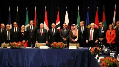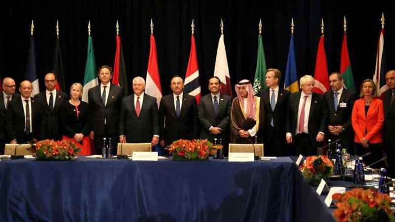 وبث الموقع الإلكتروني صورة جماعية للمشاركين في الاجتماع ظهر فيها أيضا وزير الخارجية السعودي عادل الجبير والمصري سامح شكري.
