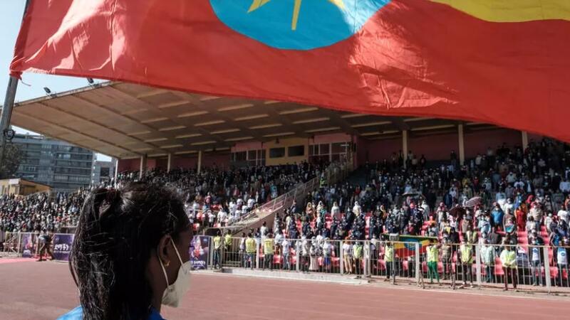 حشد يقف لإلقاء النشيد الوطني الإثيوبي خلال فعالية تبرع بالدم في أديس أبابا