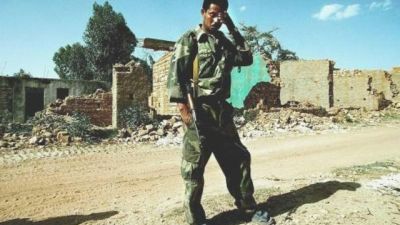 جندي اريتري يقف أمام منزل مُدمر في بلدة زالامبيسا في اريتريا
