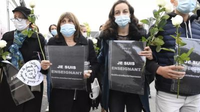 أشخاص يحملون لافتات كتب عليها "أنا مدرّس -- حرية التعبير" أمام مدرسة في كونفلان سانت اونورين.