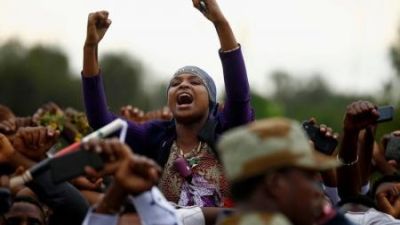 وردد المحتجون حينها هتافات معادية للحكومة ولوحوا بإشارات ترمز إلى القمع بينما لوح البعض برايات جبهة تحرير أورومو وهي جماعة متمردة محظورة.