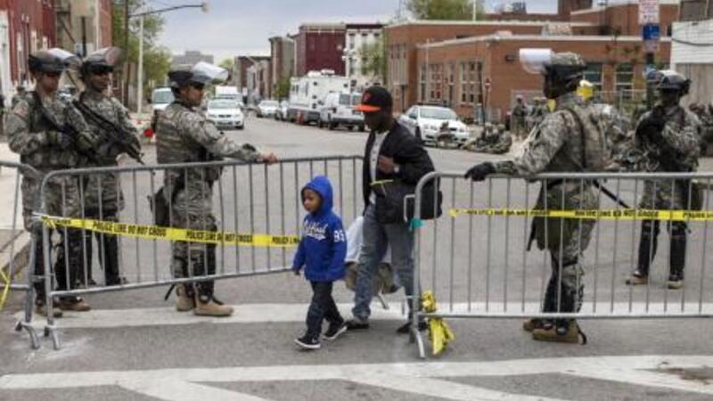 وتجمع مئات الأشخاص في موقع بعض أسوأ أعمال الشغب في حي ويست بالتيمور في ظل مراقبة مشددة من قوات الحرس الوطني وضباط الشرطة.