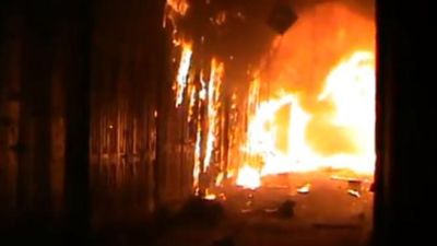 وقال نشطاء إن الحريق ربما بدأ جراء قصف واطلاق نيران شرس يوم الجمعة وأشاروا إلى أن ما بين 700 وألف متجر دمرت حتى الآن. ويصعب التأكد من هذه الروايات لأن الحكومة تحول دون دخول وسائل الاعلام الأجنبية.