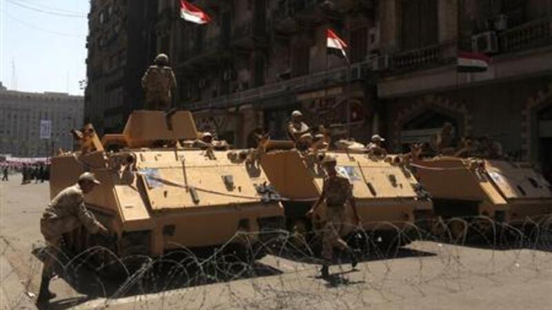 جنود مصريون يحرسون عربات مدرعة امام مدخل ميدان التحرير بالقاهرة